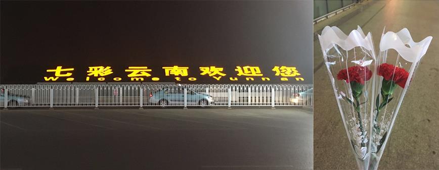 告別深圳的炎熱,迎來昆明的涼爽。落地,出機場,碰到接機的導游,首先給我們每人遞上一束鮮花。