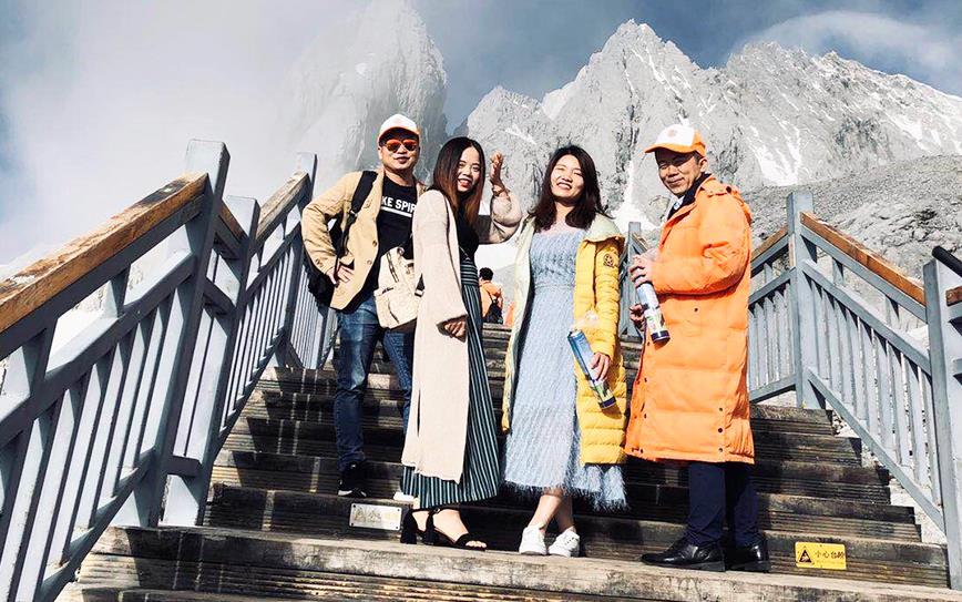 可是4506并不是我們的終點,我們一直會要前行,都在向那個迎風飄揚的鮮艷紅旗的高點進發。在補足氧氣后,一口氣爬上那一道木梯,緊張小心地呼吸著這頂峰間稀薄的空氣然后在夢開始的地方,我們重新集結,在神圣美麗的玉龍雪山上,留下了我們淺淺甜甜的笑。之后的下山索道卻顯得異常的快,身后的景色抓不住,卻也放不下。
