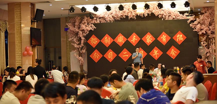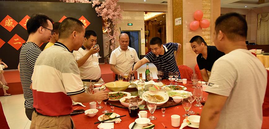 徐董致辭結束后,廠慶晚宴正式開始。大家整理著餐具,等待美食的到來。隨著一盤盤精致的菜肴陸續配齊,大家也是你一勺我一筷的享用著各色美食。 用餐之余,大家也時不時舉杯相敬,互相祝福。食至中間,徐董帶領所有公司領導到每一桌敬酒,在表達謝意的同時更祝每一位同事都能事業進步。每位同事也向徐董表示感謝并祝裕創威越來越好。 接著,公司各部門同事之間互相敬酒,以此感謝各部門在工作上的配合。