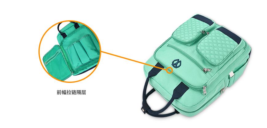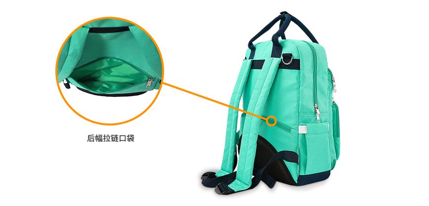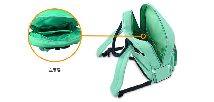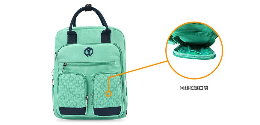 中間隔層是雙肩媽咪包的主隔層,里面富有各種口袋,方便攜帶更多物品。內側四個折邊口袋可以放入嬰兒水壺,玩具等一些中大件嬰兒用品。中間層可以放入更多尿布,毛巾和其他嬰兒清潔用品,保證出行嬰兒清潔所需。后面隔層可放入平板電腦,書籍,紙抽等物品,以便大人出行的各種需求。拉鏈口袋可以置入手機,鑰匙,錢包等隨身物品,以保證個人五瓶的安全。主隔層外側兩邊各有一個口袋,可以放入雨傘,水瓶等物品,以備不時之需。